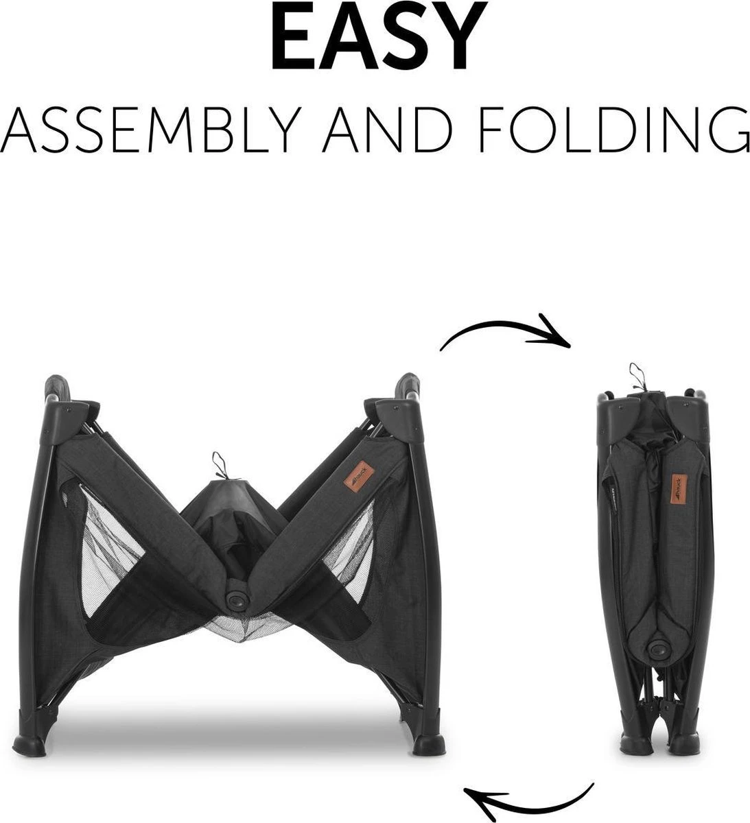 Door op de knoppen in het midden van alle vier de zijkanten te drukken, kan de montage en het opvouwen in een oogwenk worden gedaan. Compact opgevouwen berg je het reisbedje en accessoires eenvoudig op in de meegeleverde draagtas.