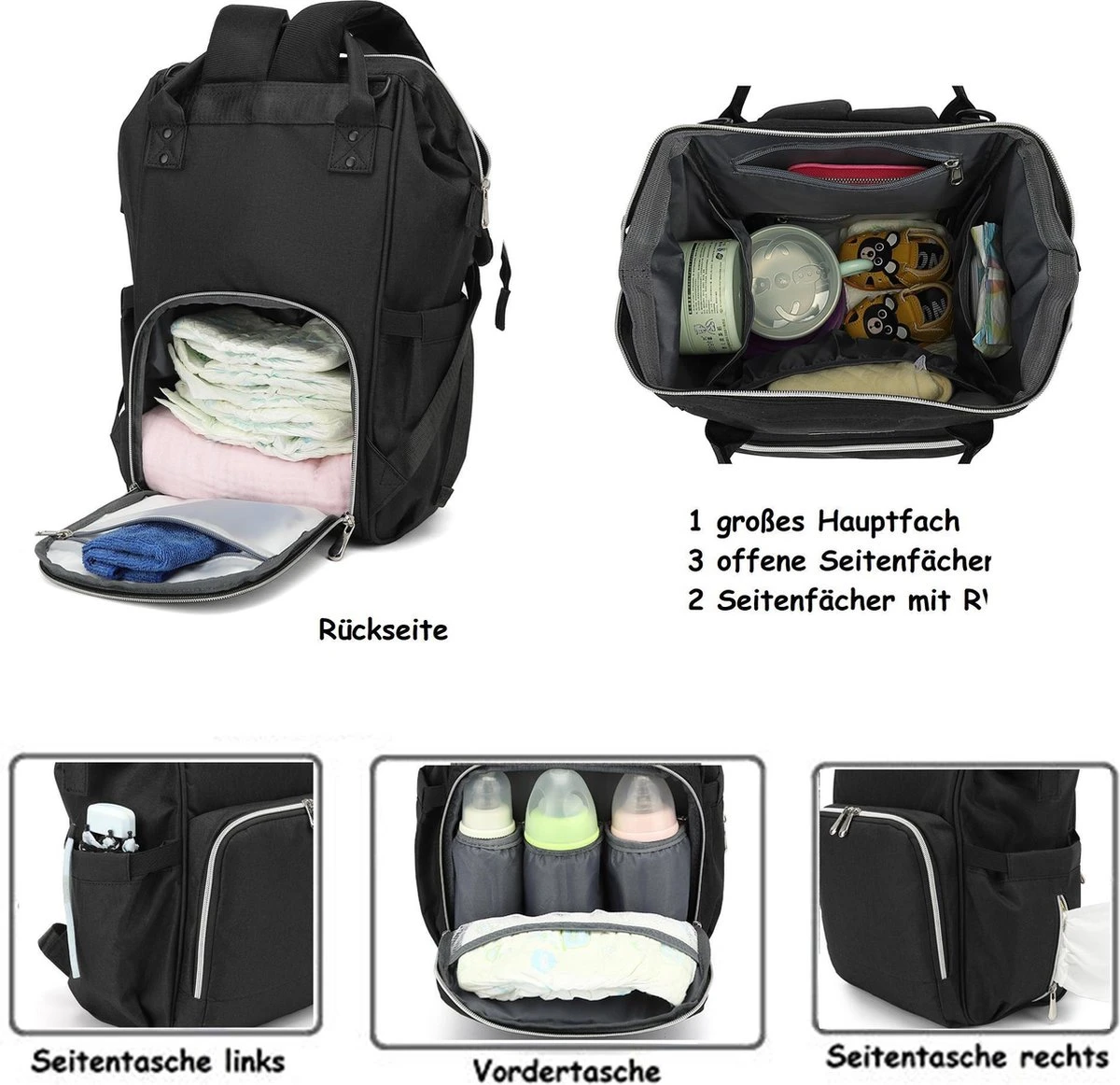 - Veel vakken: een voorvak geïsoleerd voor flessen, lussen voor lepels en een meshvak met rits. 2 zijvakken en een insteekvak met rits aan de voor- en achterkant.