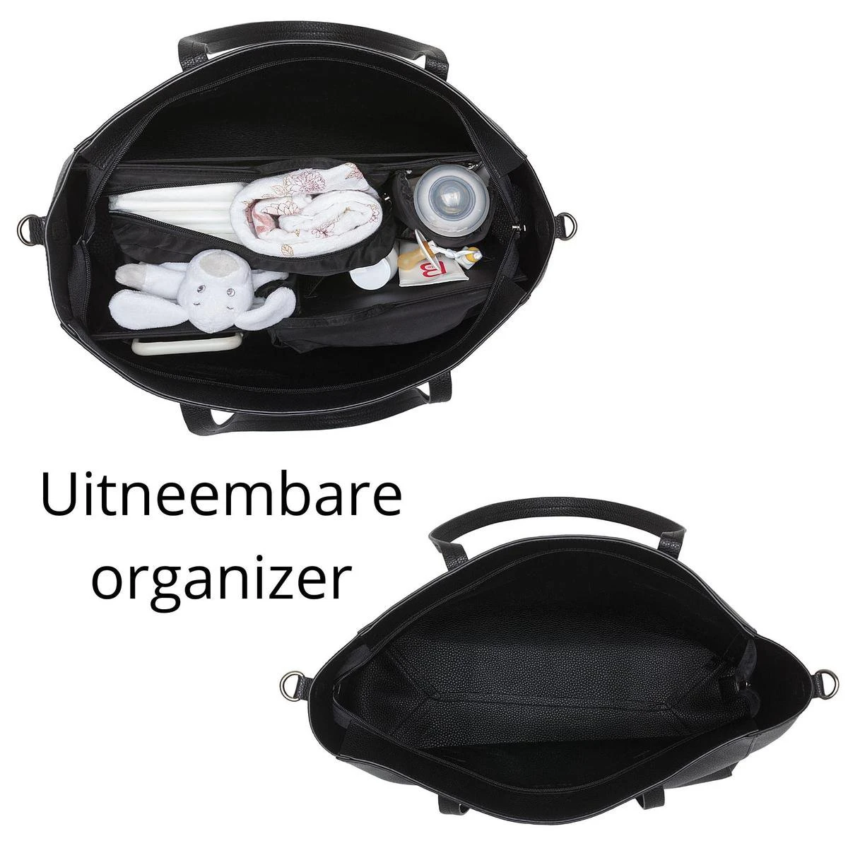 Het inpakken van je luiertas was nog nooit zo gemakkelijk dankzij de los uitneembare organizer. Deze organizer klap je eenvoudig open en je kan beginnen met inpakken…. Luiers, flesjes, melkpoeder, speentje, spuugdoekje, een extra setje kleren, speeltjes, babyvoeding en noem maar op, alles goed georganiseerd in je luiertas waardoor je nooit meer hoeft te zoeken. Zelfs aan een vakje speciaal voor je mobiele telefoon is gedacht.